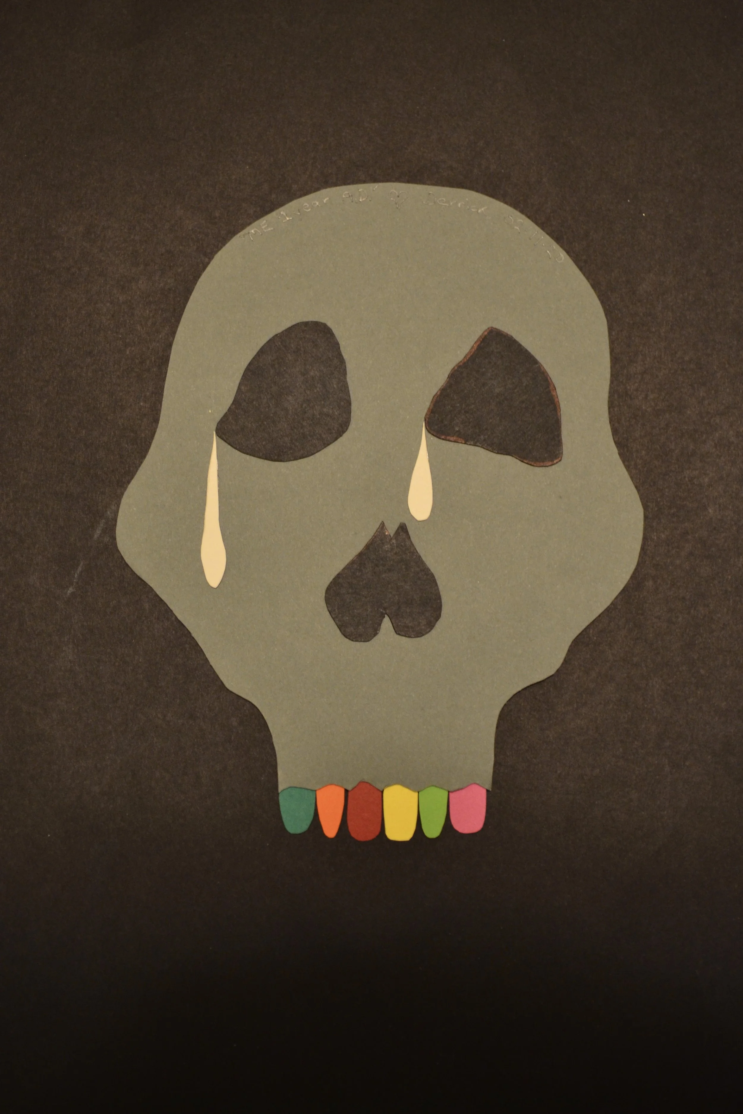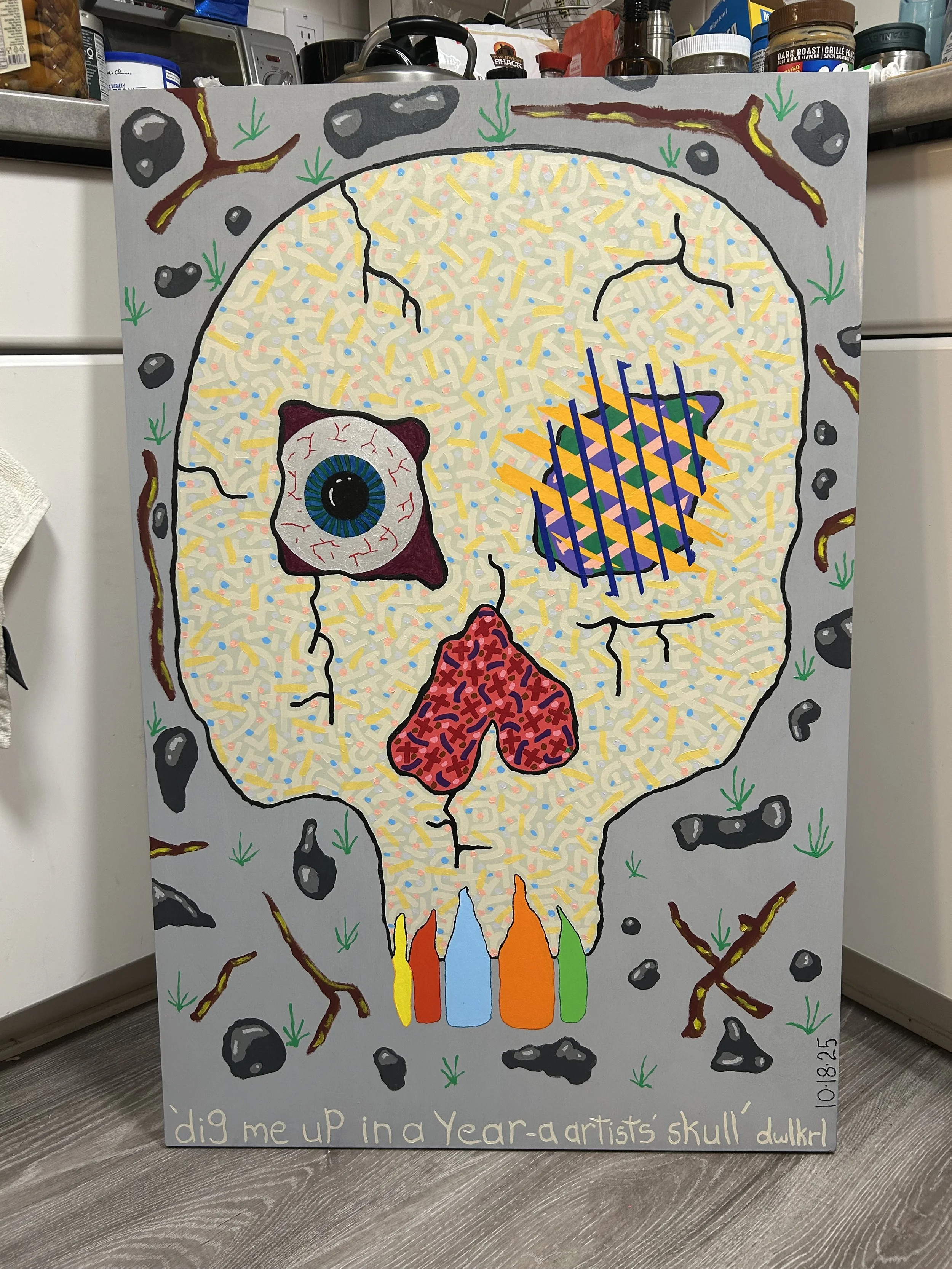 ‘the artist’s skull, 1 year A.D.’paper collage. ‘dig me up in a year-a artist’s skull’acrylic on wood, 24x36”, 10.18.25